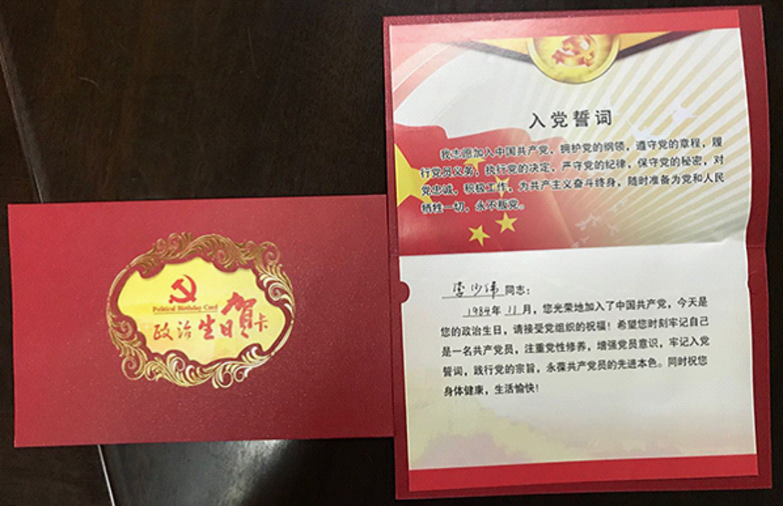 党支部书记谢晓首先介绍了政治生日的意义,党员政治生日就是党员入党的周年纪念日。每个人都有自然出生日,记住它,是对生命的珍视和尊重;每位共产党员还有政治生日,纪念它,是对党的信仰和忠诚。在建党九十七周年来临之际,党组织向全体党员赠送内有寄语的政治生日贺卡,红色祝福不仅体现了党的关怀,还提醒党员“不忘初心、牢记使命”,永葆共产党员的先进本色。