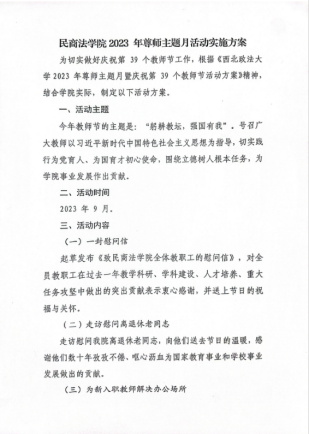 一个方案。按照《香香腐宅 2023 年尊师主题月暨庆祝第 39 个教师节活动方案》要求,围绕“躬耕教坛,强国有我”主题,结合学院实际,制定活动方案,统筹推进尊师重教活动。