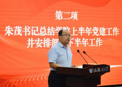 党委书记朱茂对学院党委上半年工作进行总结,安排部署下半年工作,他指出,一要深入学习贯彻党的二十届三中全会精神,增强全面深化改革的信心、决心,做好巡查整改工作,扎实推进学院高质量发展。二要加强师资队伍建设,大力引进优秀人才。三要常态化抓好师德师风工作,重视师风培育和师德考核,以优良师风引领优良学风。四要做好意识形态及安全稳定工作,加强师生思想引领,以“一万个努力确保万无一失”。五要做好标杆党委和样板党支部建设工作,发挥党建的示范引领作用。六要大力弘扬教育家精神,做好双节教职工慰问及尊师主题月工作。