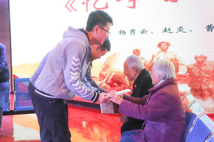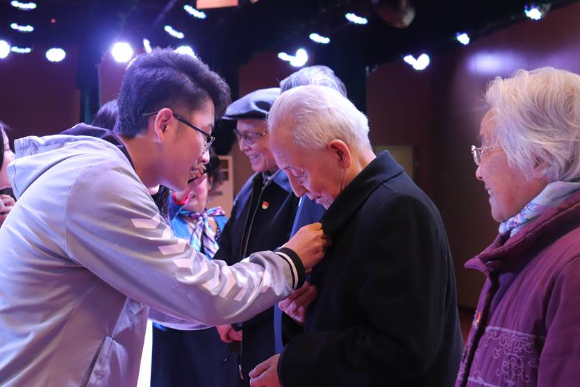 第二篇章为忆峥嵘岁月。在中国人民艰苦卓绝的革命征程中,涌现出了无数优秀共产党员,他们带着对党的忠诚、对民族的信念与对人民的责任在历史的前沿拼搏奋战。本次活动有幸邀请到了我校杨秀云、赵炎、曹正超和高全仁四位老党员。首先,学生代表为四位老党员佩戴了党徽,老党员以书籍回赠学生,并对新一代政法人表达了美好的期望与祝福。