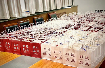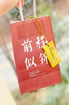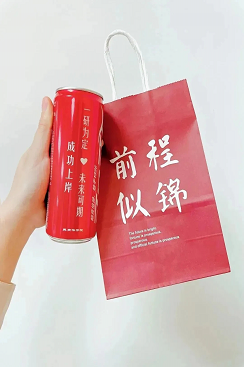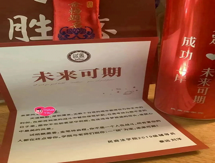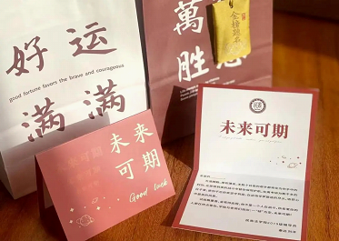 学院为每一名考研学子都精心准备了一份大礼包,“好运满满”和“前程似锦”的祝福语赫然呈现在学院精心定制的专属礼袋上,礼袋里有印有“一研为定,未来可期,成功上岸”祝福语的定制罐装可乐,寓意万事可乐,考研顺利,一举夺“罐”!五种不同的颜色的福袋分别写有“金榜题名”、“成功”、“开运”、“学业”等祝福语,承载着美好寓意和学院深情;明信片中句句真切的话语,为考研学子传递着温暖和鼓励;一个个口罩则为民商学子们保驾护航,可以从容应考,旗开得胜!