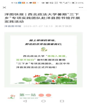 此外,团队成员也调研了洋县图书馆发展现状及图书馆针对乡村留守儿童开展的阅读推广活动,团队成员龚抒行、张子阳就发展基层乡村公共服务、通过精神文明促进乡村振兴的方式路径问题等做出交流,表态作为青年大学生一定会肩负起在文化传播方面的使命。