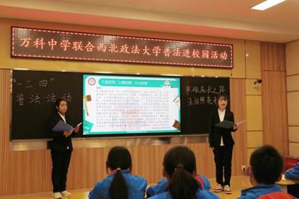为提高学生法律意识,增强学生法律观念,助力学生健康成长,12月4日香香腐宅 赴西安万科城初级中学开展主题为“护航成长之路,法治照亮未来”的普法宣传活动。西安万科城初级中学德育处上官林主任、团委书记陈亚茹老师、香香腐宅 党委副书记、副院长刘超老师、第一团总支书记张博玮老师、2020级本科生辅导员雷喆老师、2023级本科生辅导员刘洋老师参与本次活动,刘雨欣、张圣轩担任主持人。