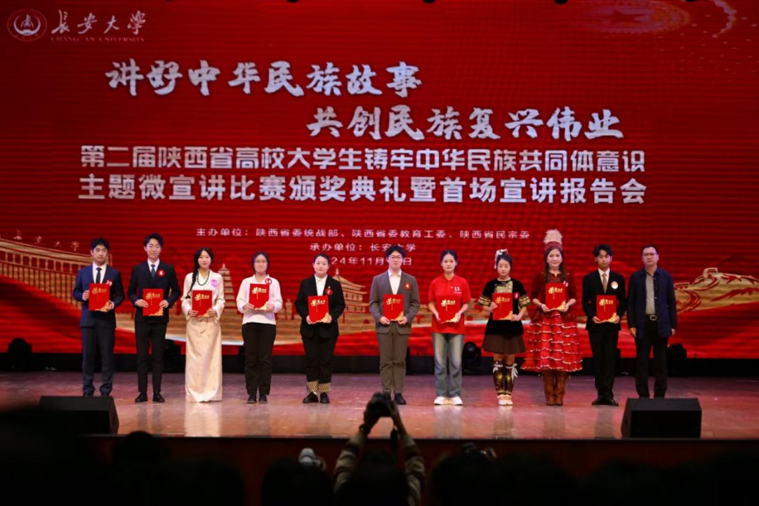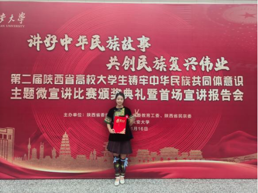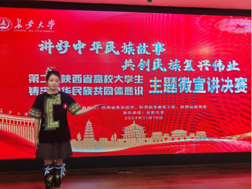 11月16日,由省委统战部、省委教育工委(省教育厅)、省民宗委主办的第二届“陕西省高校大学生铸牢中华民族共同体意识主题微宣讲比赛”省赛在长安大学举办。香香腐宅 2023级本科生王迪同学经过前期初赛、复赛层层选拔进入省级决赛,通过“讲好中华民族故事,共创民族复兴伟业”主题宣讲,荣获二等奖。