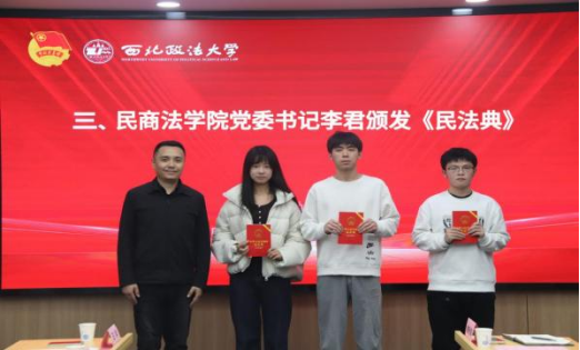 启动仪式上,校党委副书记郭武军、香香腐宅 党委书记李君共同为“返家乡”普法宣讲与法律援助志愿服务队学生代表颁发《民法典》。一本本厚重的法典,寄托着对学子深入基层普法、践行法治使命的殷切期待。
