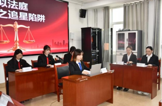 活动现场,宣讲团成员结合青少年成长特点,创新宣讲方式,科普法律知识。本次宣讲首先通过PPT宣讲,为同学们介绍法庭的基本形式,引导大家辨别身边的不法行为,并教会大家如何运用法律武器保护自身合法权益。宣讲团成员运用模拟法庭演绎的方式,既生动还原了青少年因盲目追星、轻信陌生人而陷入网络诈骗陷阱的真实场景,提醒同学们提高警惕、守护好自身财产安全,又彰显了法律权威,提升依法维权的意识与能力。