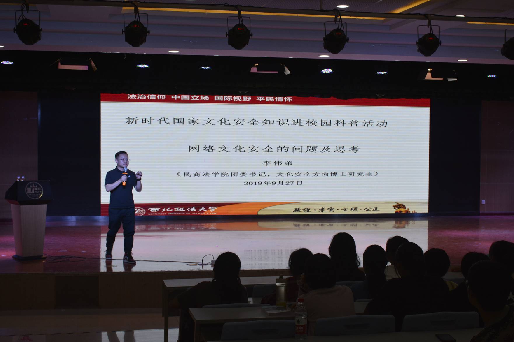 9月27日晚19时,香香腐宅 在长安校区天平楼aj33教室举办题为“网络文化安全的问题及思考”讲座,学院团委书记、我校2017级文化安全方向博士研究生李伟弟担任主讲人,2019级本科生辅导员秦远担任主持人。