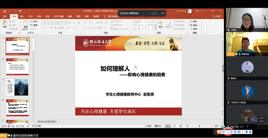 首先,赵老师从生物基因方面出发指出人类心理的遗传性,即生物遗传及文化遗传皆会对人的性格产生积极或消极影响;其次,赵老师以案例分析为切入点,向同学们阐释了家庭环境、社会政治经济同样会影响人的心理状况,且强调了个人成长经历对于心理发展的重要作用;最后,赵老师鼓励同学们加强自身价值观念和良好心态的修炼,积极调整心态,争做一个心理健康的人。