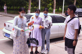 扣杯游戏要求同学们向地面投塑料杯,若投出的塑料杯与地面上已经摆放好的杯子扣在一起,则可获得奖品。这个小游戏难住了不少参与的同学,由于杯子较轻,易受风力影响,导致投掷点和最终的杯子着落点产生偏差。但同学们并没有就此气馁,而是进行了多次尝试。这个小游戏锻炼了心理素质,让同学们在屡次失败的体验中不断调整技巧和心态,同学们也在游戏中收获了乐趣。