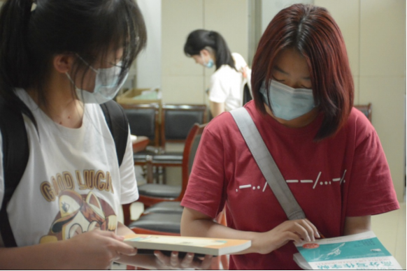 活动中,2022届毕业生将自己的专业书、课外书以及考研资料等捐赠给学弟学妹们,收到捐赠书籍的在场同学为表达感激,在明信片上写下了对学长学姐的祝福,亲手送给在场的学长学姐们。希冀与憧憬在书中传递,感激与祝福在卡片中流露。