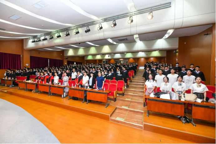 仪式第一项,全体师生起立奏唱国歌。庄严激昂的国歌声唱响在满天星会场,民商学子始终立足中国立场,怀揣法治信仰,在完成本科四年的专业学习后,2022届毕业生即将作为新时代中国的法治建设者,走向广阔天地。