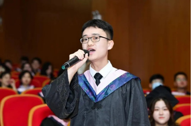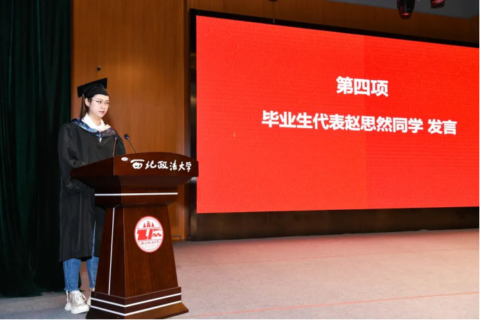 仪式第四项,2018级3班赵思然同学作为毕业生代表上台发言,赵思然首先代表全体毕业生向学院领导与老师表达了敬意与感谢。她表示,在师长的精神引领与影响之下,她收获了堂堂正正做人,圆圆满满治学的态度,在大学四年中不断探寻、不断进步,在被定义的优秀模板之外发现了熠熠生辉的人生。并祝福全体毕业生在接下来的人生道路上不被定义与标签束缚,能够追风赶月,再谱新篇。