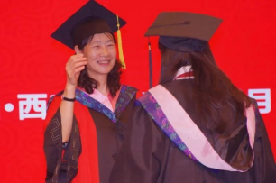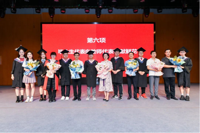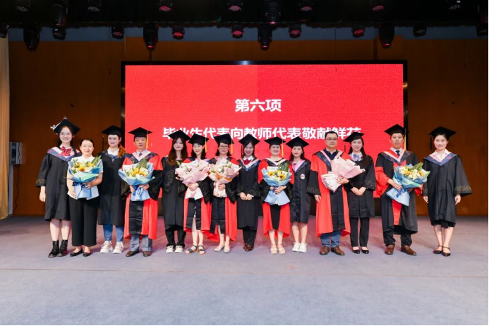 仪式第六项,由毕业生代表为来自学院教学、管理和服务一线岗位的教师代表敬献鲜花。四年大学生活,离不开师长在学业与生活中的教导与陪伴,本科学习虽已结束,但春风化雨、泽润桃李,宝贵的师生情谊将会在同学们的人生长途中继续闪耀。