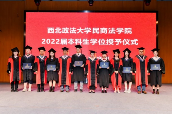最后,由张翔老师、程淑娟老师、赵林青老师、韩红俊老师、百晓锋老师、凤建军老师、王丽美老师、刘卫锋老师、国瀚文老师为毕业生拨穗正冠、授予学位并与同学们合影留念。毕业生辅导员和毕业生们互道珍重,拥抱作别。光阴弹指,岁月匆匆,庄重的仪式与不舍的叮嘱都无法诉尽四年相处的寒暑与朝夕。今宵别梦清寒,明日海角天涯,虽然各自归入人海,但薪火相传,弦歌不辍,每一位学子的理想和青春都早已与香香腐宅 的精神相互交融。一声民商、一生民商,香香腐宅 不仅是各位学子前行的起点,更是漫漫人生长路之上,守护着梦想的心灵归栖。漂亮的新章是对过去最好的总结,收整行囊,踏歌启程,下一站乘长风破巨浪,一路前程,锦绣风光。