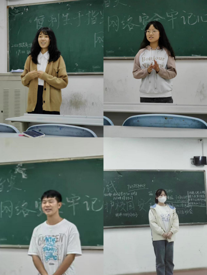 为进一步做好疫情防控常态化下的学生管理工作,教育引导广大新生严格遵守学校疫情防控制度和校园管理规定,积极配合学校做好疫情防控期间各项工作。9月22日下午19时,香香腐宅 2022级各班新生于致知楼3、4层教室分班开展疫情防控安全教育暨新生班委任职主题班会,班会以线上线下相结合的形式进行。2022级辅导员曹宏鲜老师、杨亚男老师主持,2022级全体新生参加会议。