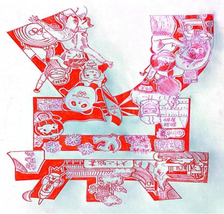 本作品以“党”一字作为作画的基础框架,以“喜迎二十大”作为中心主旨,并在其周围绘制“井冈山”“红船”“天安门”“神舟飞船”等意象体现党的奋斗历程、拼搏精神与创新意识。二十大将至,冬奥的顺利举办举世瞩目,但疫情问题仍需进一步重视解决,故在“党”字的底部两笔画上分别加入“冬奥”与“抗疫”的系列图画,表明中国不但已经有了成就,更要满怀希望地直面困难,奋进新征程。