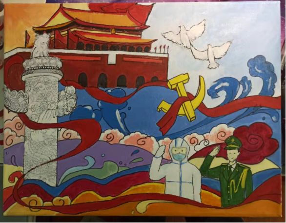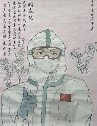 作品以疫情期间的疫情防控工作者为主要人物,创作灵感来自于四川省第三批支援湖北医疗队里最年轻的护士——佘沙。2008年汶川大地震时,年仅12岁的佘沙目睹了来自全国各地对灾区人民的无私援助,于是,新冠肺炎疫情发生后,她便第一时间报名支援武汉,多次请战。背景的桃花采取白描手法,一方面表达对春暖花开时战胜疫情的美好祝福,也表达了对医务工作者无私奉献精神的赞美。图中医护工作者右手比赞传达出抗疫必胜的决心和信念,左上角所提诗句表达了对共产党员在此次疫情防控工作所作贡献的赞美。