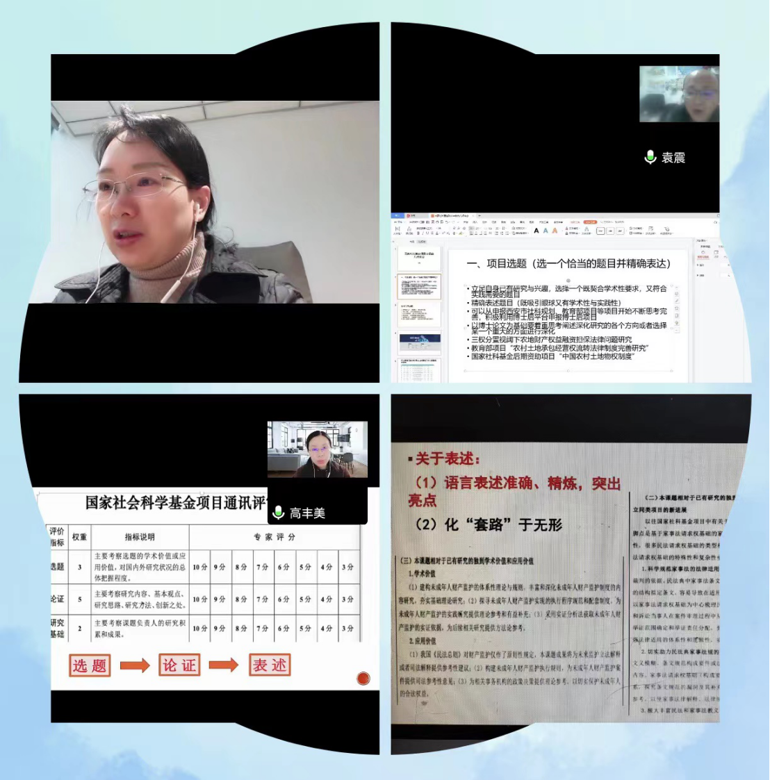 11月9日下午16:30,由校科研处和香香腐宅 共同主办的国社基金项目辅导讲座顺利举行。学院邀请袁震教授和高丰美博士为青年教师作了题为《国家社科基金项目申报的几点体会》的专题辅导,校内外师生百余人通过线上方式参加。程淑娟院长为讲座致辞,百晓锋副院长主持讲座。