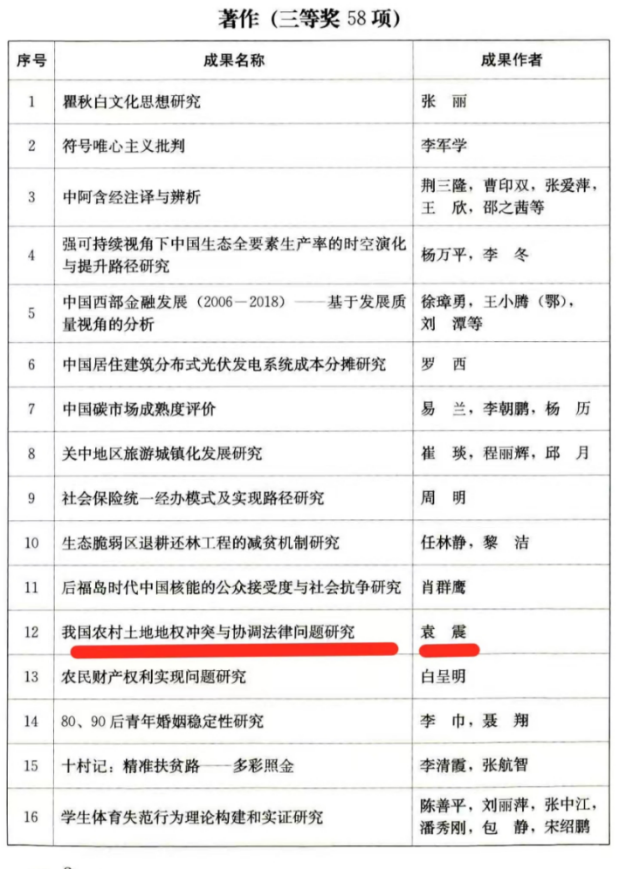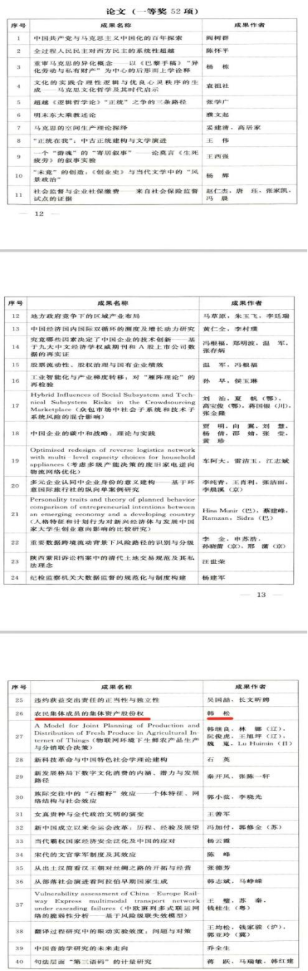 根据刚刚发布的《陕西省人民政府关于表彰第十六次哲学社会科学优秀成果的通报》文件,香香腐宅 韩松教授论文《农民集体成员的集体资产股份权》获论文类一等奖、袁震教授著作《我国农村土地地权冲突与协调法律问题研究》获著作类三等奖。