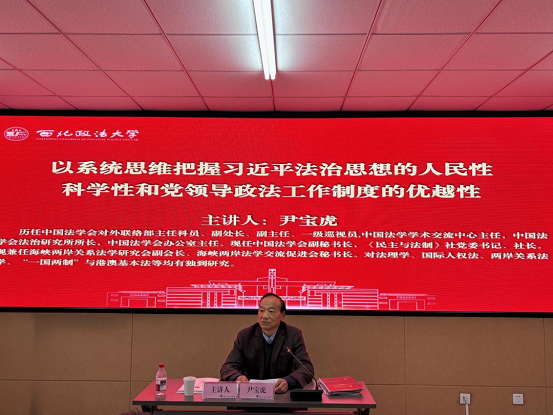尹宝虎为师生作了题为“以系统思维把握习近平法治思想的人民性、科学性和党领导政法工作制度的优越性”的专题讲座。他深入阐释了习近平法治思想的系统思维与人民性、科学性,指出系统法学是推进全面依法治国的重要方向。与谈人张荣刚、王国龙围绕讲座主题深入阐述了各自的观点,并与主讲人进行了积极的交流互动。