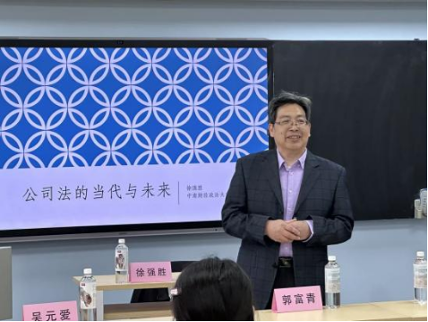 2026年4月10日上午,我院邀请中南财经政法大学法学院教授、博士生导师、“楚天学者”特聘教授、中国法学会商法学研究会副会长徐强胜作专题讲座。讲座由我院教授博士生导师郭富青主持,学院副院长凤建军、张晓飞副教授担任与谈人。