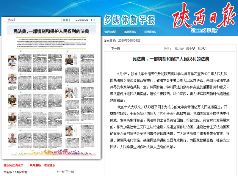6月3日,我省法学会组织召开的陕西省法学法律界学习宣传《中华人民共和国民法典》座谈会在西安举行,省法学会主要负责人出席并讲话。来自我省法学法律界的专家学者共聚一堂,共同解读、学习民法典颁布和实施的重要作用和意义,带头宣传推进民法典实施,建设平安陕西,法治陕西,奋力谱写陕西新时代追赶超越新篇章。