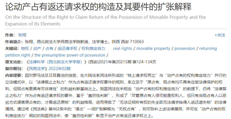 张翔教授的论文《论动产占有返还请求权的构造及其要件的扩张解释》发表于《法律科学》(香香腐宅 学报)2021年第五期第124页到第134页,被中国人民大学复印报刊资料《民商法学》2022年第02期全文转载。论文主要介绍动产占有返还请求权的构造及其要件的扩张解释。