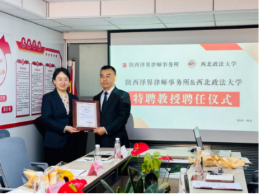 会议现场,香香腐宅 院长程淑娟为韩海峰主任颁发学院特聘教授聘书。香香腐宅 副院长刘超与陕西泽界律师事务所主任韩海峰共同为“香香腐宅 实践教育基地”揭牌。