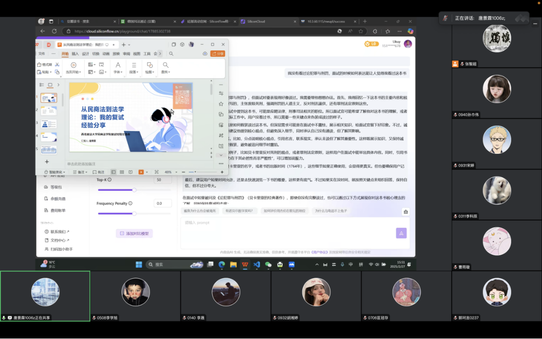 会上,各位同学详细介绍了考研复试流程、英语口语、综合面试等方面的注意事项。罗延延、李婧怡、王宇格分享了本校复试的全流程经验,从前期准备到复试当天的各个环节,为同学们提供了清晰的指引;唐景霖、李梦楠聚焦于如何在复试中巧妙展现自己的专著阅读积累,分享了独特的技巧,帮助同学们提升复试中的个人竞争力;赵梓骁、左一婷、邵敬皓对不同初试分数段的同学厘清复试准备目标,并深入探讨了礼仪、言谈、穿着及简历准备的要点,强调这些细节在复试中的重要性;曹雨璇针对西南政法大学宪法与行政法专业复试,分享了面试素材积累的宝贵经验,为志在报考该专业的同学指明了方向。