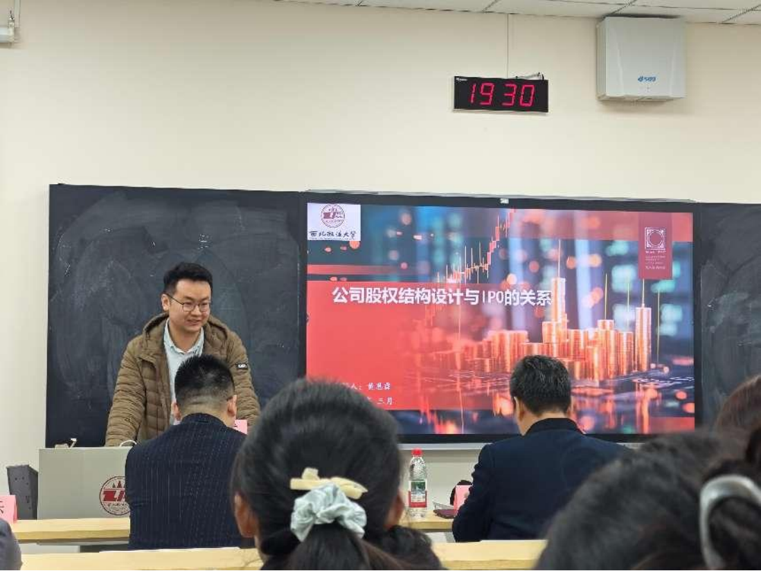 黄恩霖律师基于自身丰富的实践经验,以“公司股权设计与IPO的关系”为主题,从“股权架构设计与公司IPO、权与责—控制权与风险隔离、税务筹划—与隐藏股东合作三个部分展开细致讲解。首先,黄律师介绍了复杂的股东背景与IPO企业股权结构以及员工持股平台的设立与运作原理,指出了上市公司中股东背景的多样性和股权的间接持有性。其次,黄律师结合生动具体的实践案例分析了上市公司所面临的各种问题和具体的应对策略。接着,黄律师进一步分析了有关控制权的相关问题,例如实际控制人的判断标准和无实际控制人企业的治理结构、认定审核标准等。最后,黄律师对同学们提出的问题进行答疑解惑,建议同学们利用空闲时间学习会计知识和税务知识,并为大家未来的职业规划提供指导。