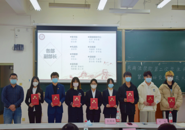 大会第十二项,主持人介绍新一届主席团成员,宣布新一届学生会各部门部长、副部长,由学刘超老师为新一届学生会主席团成员颁发聘书,丁磊老师为学生会各部门部长颁发聘书,张博玮老师和雷喆老师为各部门副部长颁发聘书,并拍照留念。