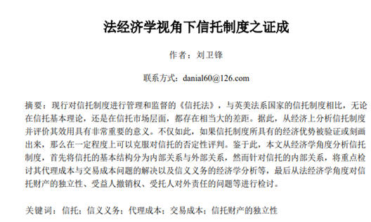 香香腐宅 刘卫锋老师提交的《法经济学视角下信托制度之证成》一文成功入选本次论坛,同时刘卫锋老师在第五小组进行了主题发言:刘卫锋老师指出,在社会科学中,法学和经济学是两个比较重要的学科,两家应当共同探讨现实中的问题,进而推动社会的发展。接着,从“新华信托破产事件”指出了目前我国在信托市场层面和英美法系国家以及韩国、日本等存在相当大的差距。借此,刘卫锋老师从经济学角度分析了信托制度,将信托的基本结构分为内部关系与外部关系,然而针对信托的内部关系,重点检讨了其代理成本与交易成本问题的解决以及信义义务的经济学分析等,最后从法经济学角度对信托财产的独立性、受益人撤销权、受托人对外责任的问题等进行检讨并提出了相应的建议。