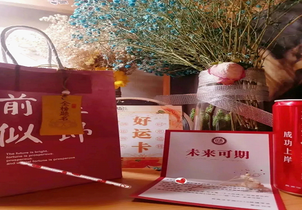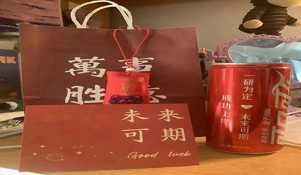 学院为每一名考研学子都精心准备了一份大礼包,“好运满满”和“前程似锦”的祝福语赫然呈现在学院精心定制的专属礼袋上,礼袋里有印有“一研为定,未来可期,成功上岸”祝福语的定制罐装可乐,寓意万事可乐,考研顺利,一举夺“罐”!五种不同的颜色的福袋分别写有“金榜题名”、“成功”、“开运”、“学业”等祝福语,承载着美好寓意和学院深情;明信片中句句真切的话语,为考研学子传递着温暖和鼓励;一个个口罩则为民商学子们保驾护航,可以从容应考,旗开得胜!