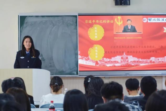 公安学院宣讲人姚朵朵通过分享自己于西安、延安等地见闻中切身感受到的中华优秀传统文化和革命文化,引出了文化自信这一中心话题,经由民族自豪感的深切感召,呼吁青年学子坚定文化自信,自觉做中华优秀传统文化的传承者和弘扬者,赓续中华文脉,书写时代强音。