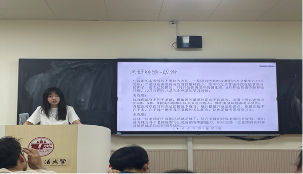 交流会上,两位同学结合各自的考研及复试经历,从升学和就业两个维度,为同学们做了深入讲解,并对部分重点院校历年考研报录比等信息进行了分析解读,帮助同学们明确了法硕与学硕的区别与联系,并就如何与导师进行交流和沟通分享了经验。交流会期间,同学们积极提问交流,邵潇同学和文卓同学针对大家提出的问题,结合报考院校及专业逐一进行了回答并提出了针对性建议。