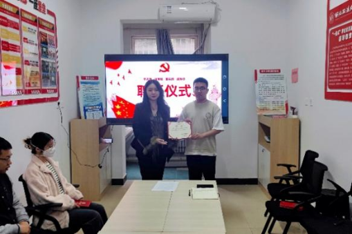 仪式第二项,秦远和刘洋为“筑梦青年”党员志愿服务队红色宣讲先锋、政策咨询先锋、普法宣传先锋、学业指导先锋、就业帮扶先锋代表颁发聘书。