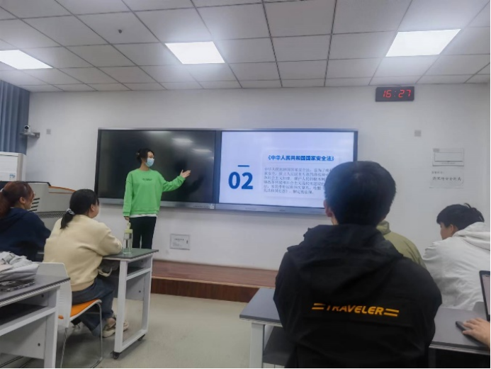 学习国防知识,加强国防教育。各班团支书为同学们介绍了我国与保密相关的国家安全法律法规,进一步明确了总体国家安全观的具体要求。同学们围绕国家安全的基本概念、当前国内国际形势、危害国家安全的行为及罪名、维护国家安全这四个方面进行了解,深入学习了习近平总书记关于总体国家安全观和国家安全工作的重要论述。