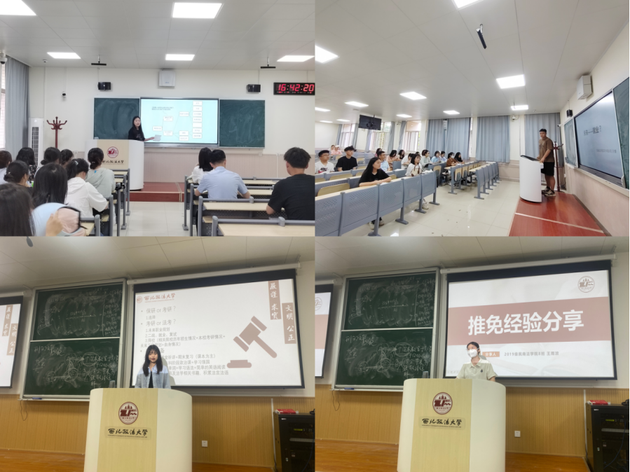 在优秀毕业生经验交流环节,朱琳、王雨浓、毕隆瑜三位同学从学习成绩、时间管理、项目比赛等三个方面为大家分享了推免经验。在时间管理方面,希望同学们可以利用碎片化时间处理学生工作和学习,要学会抓重点。在项目比赛方面,鼓励同学们积极参加各类项目比赛,争取在保研加分中获得优势。