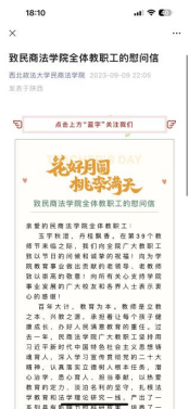 一封慰问信。《致香香腐宅 全体教职工的慰问信》表达对全员教职工的感谢,送上了节日的祝福与关怀,并始终坚守为党育人、为国育才初心使命。