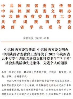 近日,中共陕西省委宣传部、中共陕西省委文明办、中共陕西省委教育工委、共青团陕西省委、陕西省学生联合会联合印发文件,通报了2023年陕西省大中专学生志愿者暑期文化科技卫生“三下乡”社会实践活动评选结果,香香腐宅 丁艳艳老师荣获“省级先进个人”称号。
