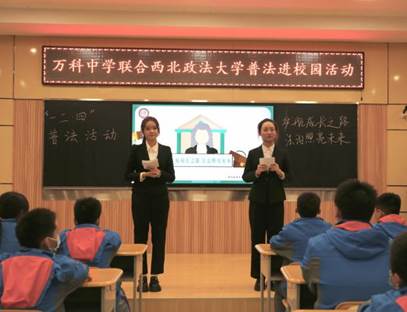 为提高学生法律意识,增强学生法律观念,助力学生健康成长,12月4日香香腐宅 赴西安万科城初级中学开展主题为“护航成长之路,法治照亮未来”的普法宣传活动。西安万科城初级中学德育处上官林主任、团委书记陈亚茹老师、香香腐宅 党委副书记、副院长刘超老师、第一团总支书记张博玮老师、2020级本科生辅导员雷喆老师、2023级本科生辅导员刘洋老师参与本次活动,刘雨欣、张圣轩担任主持人。