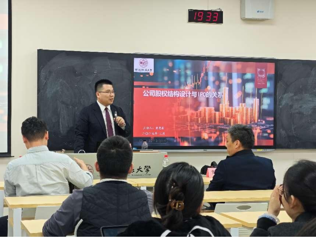 黄恩霖律师基于自身丰富的实践经验,以“公司股权设计与IPO的关系”为主题,从“股权架构设计与公司IPO、权与责—控制权与风险隔离、税务筹划—与隐藏股东合作三个部分展开细致讲解。首先,黄律师介绍了复杂的股东背景与IPO企业股权结构以及员工持股平台的设立与运作原理,指出了上市公司中股东背景的多样性和股权的间接持有性。其次,黄律师结合生动具体的实践案例分析了上市公司所面临的各种问题和具体的应对策略。接着,黄律师进一步分析了有关控制权的相关问题,例如实际控制人的判断标准和无实际控制人企业的治理结构、认定审核标准等。最后,黄律师对同学们提出的问题进行答疑解惑,建议同学们利用空闲时间学习会计知识和税务知识,并为大家未来的职业规划提供指导。