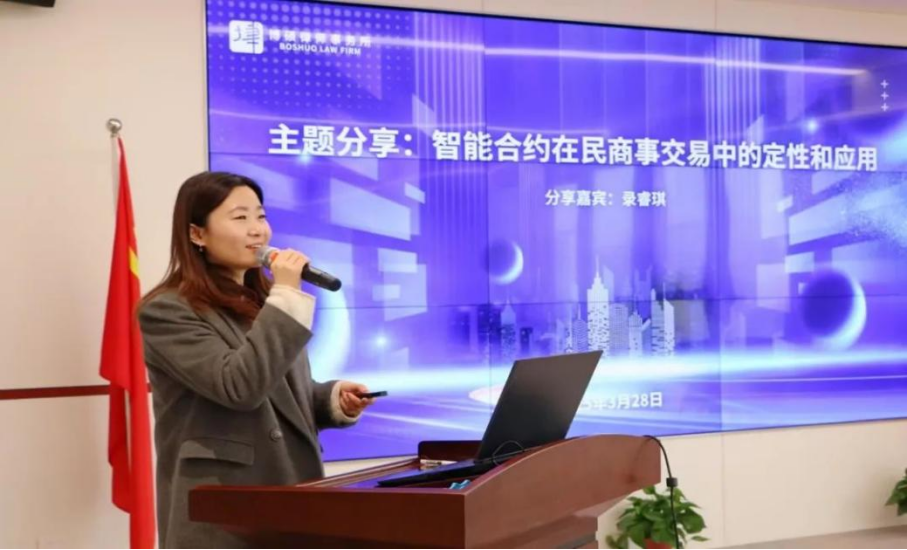 随后,录睿琪在专题分享环节中以《智能合约在民商事交易中的定性和应用》为题做专题报告。她从民商事法律视角切入,系统探讨智能合约的技术特性与法律属性间的张力,为法律体系适应区块链时代的新型交易模式构建了基础性认知路径。
