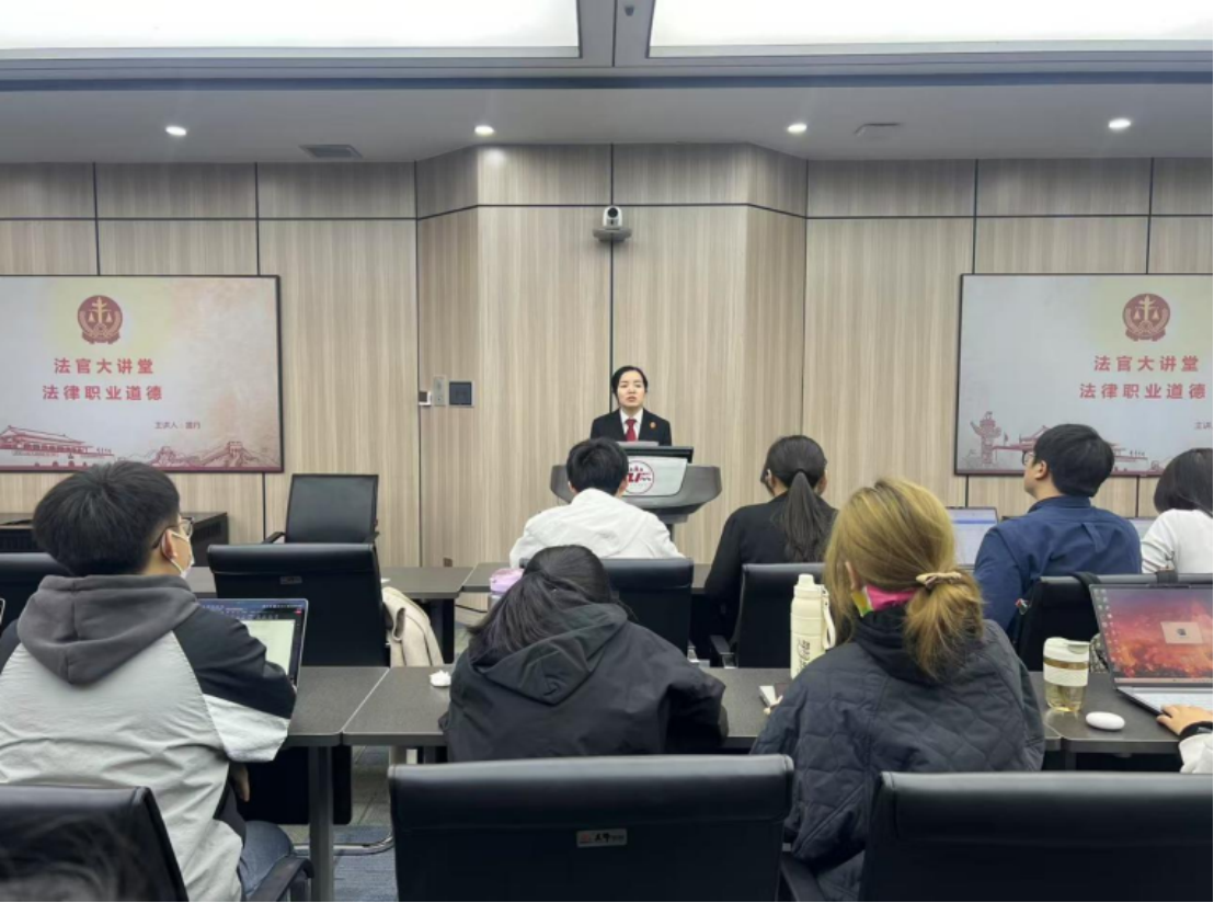 雷丹法官还提出,法律职业者要有一颗淡泊名利之心。法律职业是一个自主自律的职业,法官、检察官、律师等法律职业都有其必须遵守的职业道德规范。因此,成为一名优秀的法律职业者必须要加强自我管理,要爱岗敬业、清正廉洁、克己奉公,要信仰法律、崇尚法律。在办案中不畏权势,不徇私情不谋私利,正确处理法律与情理,法律与道德之间的关系,维护法律的尊严,让清廉之花盛开在自己的职业生涯。