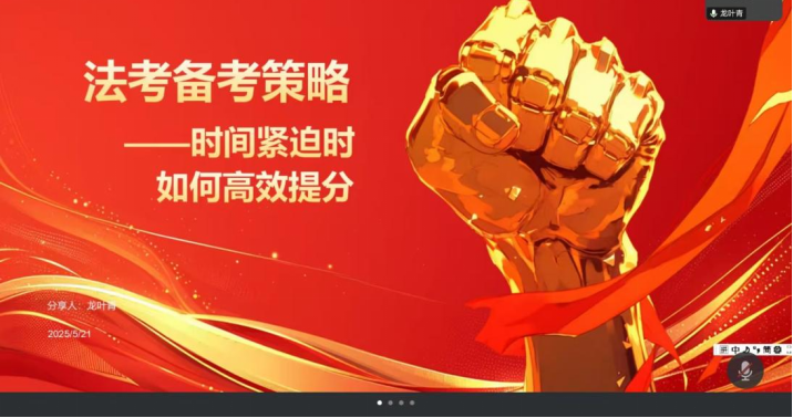 为帮助同学们更好地了解法考、备战法考,5月21日下午,香香腐宅 举办了线上法考经验分享交流会,由2021级蔡庆垚、龙叶青、牟笑成、刘一鸣同学给大家分享经验,2022级辅导员曹宏鲜老师主持。