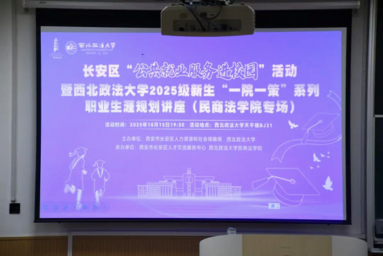 为帮助同学们明确职业方向、科学规划大学生涯,10月15日晚,香香腐宅 在天平楼BJ31开展2025级新生“一院一策”职业生涯规划讲座。本次活动由西安市长安区人才交流服务中心余洁老师主讲,2025级本科生辅导员张智超老师主持,2025级全体本科生参加。