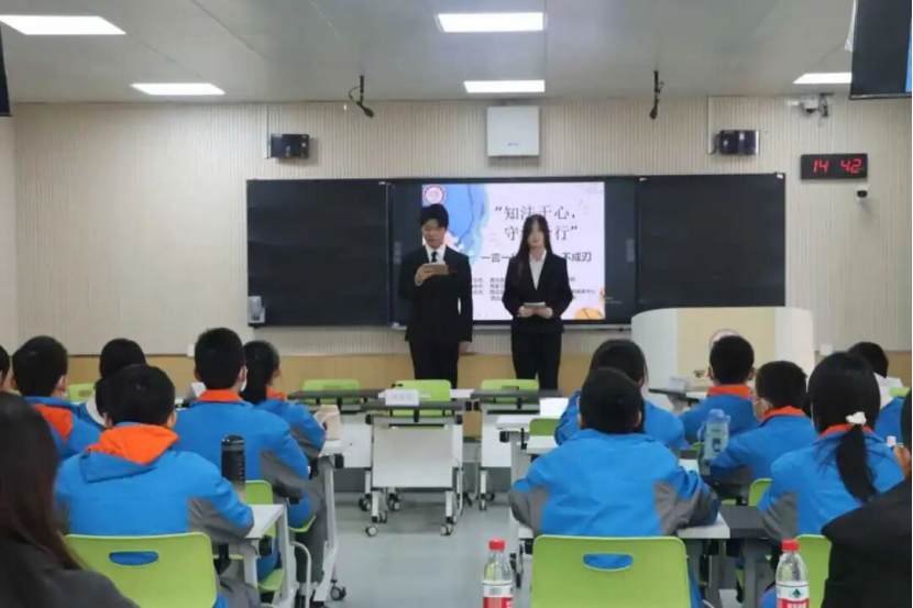 宣讲环节,学院学生会志愿者陈之南与张欣雅分别为万科城学生代表们进行了普法宣讲。陈之南以真实案例为依据,辅以法律条文,详细讲述了校园欺凌的三大典型案例及网络暴力的常见行为,引导同学们树立法治观念,学会运用法律武器维护自身合法权益;张欣雅则讲解了法庭判案的全过程,细致阐述了法庭判案的流程和法庭调查的支线任务,帮助同学们拓展庭审知识,深入了解法庭审判的相关内容。
