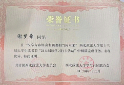 我始终以高标准严格要求自己,在思想上积极追求进步,牢记“法治信仰,中国立场,国际视野,平民情怀”校训,主动参与马克思主义学院举办的“党史观教育融入高校思政课教学展示活动”,并获得三等奖。认真学习党的创新理论,在班级“红色经典诵读”“党史学习分享会”等活动中感悟初心使命,不断筑牢信仰之基,获得入党积极分子培训机会,用坚定的理想信念指引前行方向。