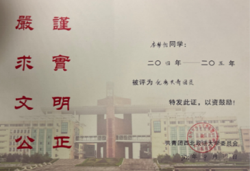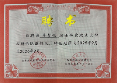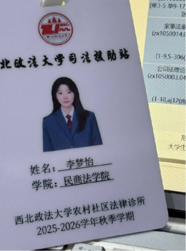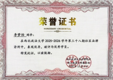 感恩于心,履责于行。国家与学校的资助不仅为成长之路保驾护航,更让我深刻体会到青年一代肩负的责任与使命。在实践中锤炼本领,在服务中践行初心,成为我不变的追求。 实习期间,我于2025年7月-8月在西安市灞桥区人民法院参与实习,期间参与庭审记录、拟写法律文书、整理案卷材料,累计记录案件相关表格9份,拟写法律文书20余份,以严谨认真的态度赢得实习单位高度认可,成功入选优秀实习生推荐名单。此外,我有幸参与诊所法院值班,将课堂所学转化为实践能力,在直面群众法律需求的过程中,深化了对法律职业的认知与坚守。 公益路上,我始终步履不停。在第四届“金唐杯”法治与文化主题辩论邀请赛中获评优秀志愿者,用实际行动传递法治温度。在奉献中收获成长,在担当中共筑温情。
