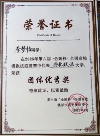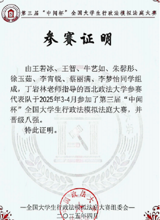 “立身以立学为先,立学以读书为本。”在学术与竞赛领域,我始终保持探索热情,不断突破自我。模拟法庭赛场是我深耕专业的重要阵地,先后参与第三届“中闻杯”全国大学生行政法模拟法庭大赛(晋级八强)、第六届“金陵杯”全国高校模拟法庭竞赛(团体优秀奖),更斩获第十一届全国大学生模拟法庭竞赛全国一等奖,在2025“理律杯”全国模拟法庭竞赛获得全国三等奖,在攻防辩论与文书撰写中夯实法律功底。科研与创新方面,我聚焦法律实务与社会需求,参与《中小微企业法律服务最优模式探析——基于陕西省的实证研究》等法学调研报告撰写,深耕数字法方向研究与案例研习,形成扎实的学术积累。创新创业大赛中,我牵头或参与多个项目,其中《绿洲法链——西北民族生态智慧数字化赋能环境治理》获省级立项并担任负责人,《曼乔“枣上好》《“知灯领航”——AI营销中介赋能乡村小微企业》均获省级立项,部分项目获校级金奖、铜奖,以创新思维回应社会痛点。